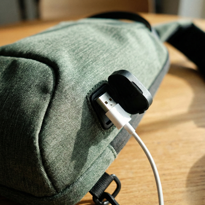 The bag includes an external USB port that connects to your own power bank placed inside (power bank not included). Simply plug your power bank into the internal cable and connect your phone to the outer USB port to charge while you’re on the move.