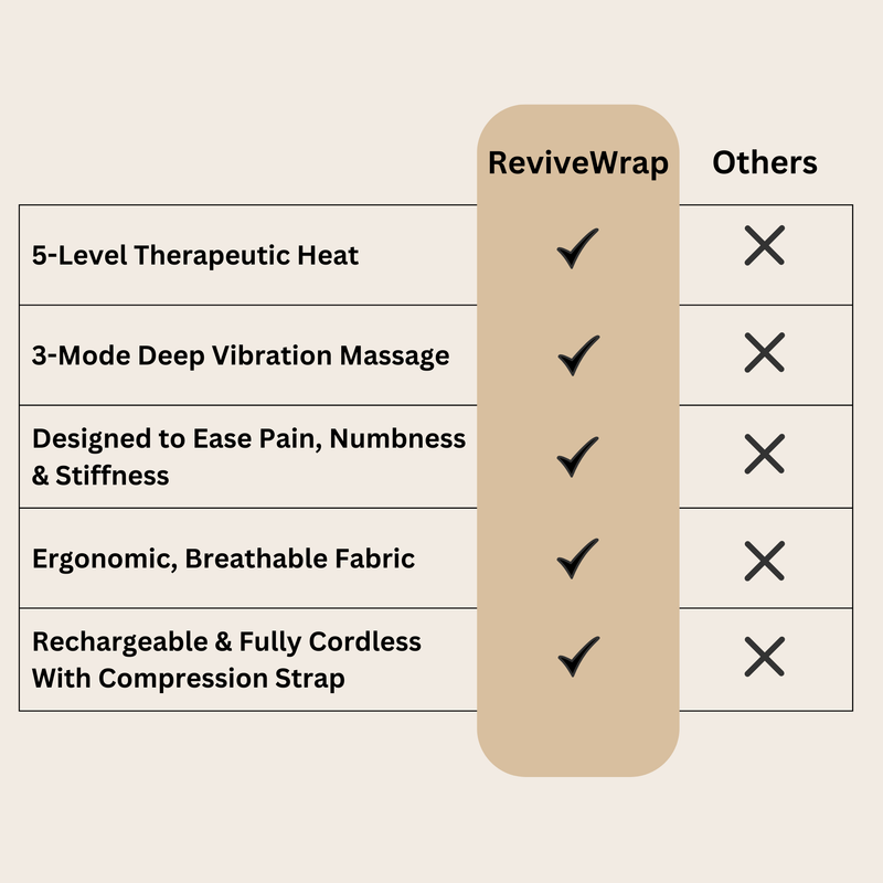 Yes. ReviveWrap combines 5-level heat therapy and 3 vibration modes to boost circulation, relax tight muscles, and ease deep joint discomfort. Most users feel noticeable relief within days.