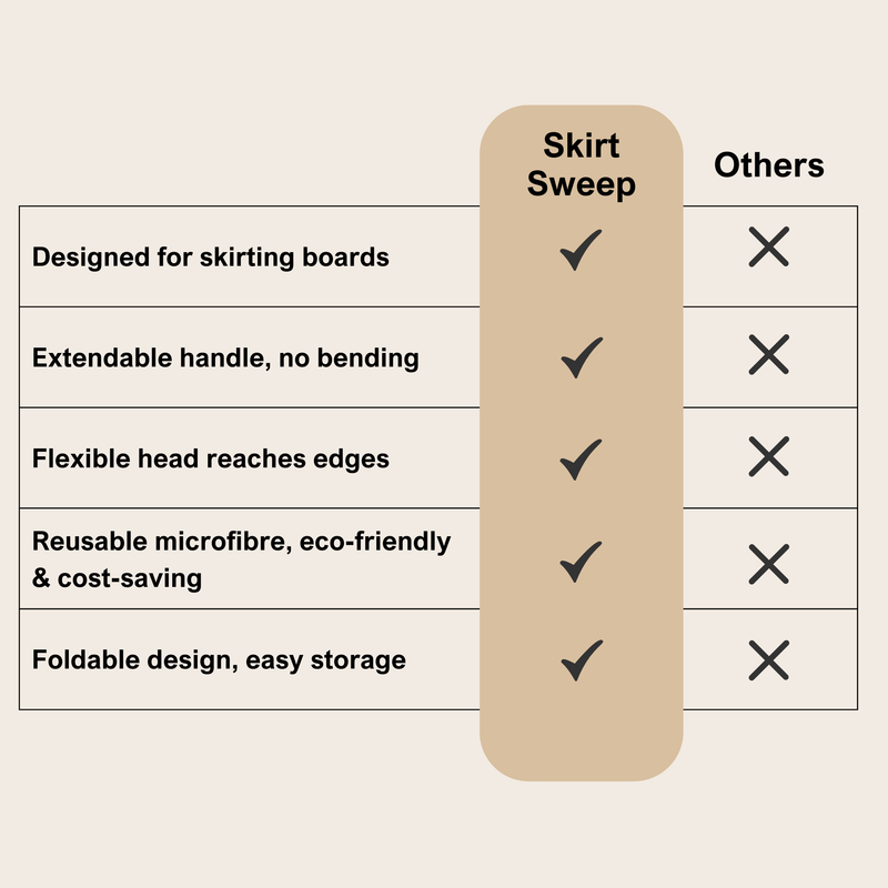 “I didn’t realise how much dust was hiding along my skirting boards until I tried SkirtSweep! The extendable handle makes it so easy to reach every corner without bending or stretching. It genuinely cuts my cleaning time in half, and the microfibre head picks up everything in one go. My home feels so much fresher now.”