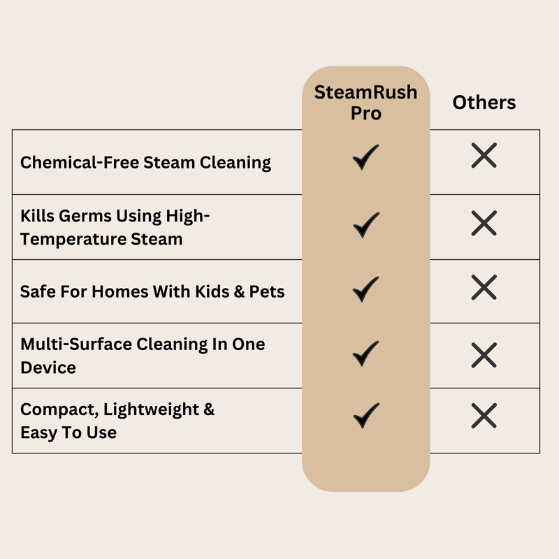 Traditional cleaners rely on harsh chemicals and endless scrubbing — yet grime still lingers. SteamRush Pro uses pressurised, high-temperature steam to cut through grease, dirt and germs using only water. It’s a fast, powerful, chemical-free cleaning solution designed for busy homes, families, and multi-surface use.